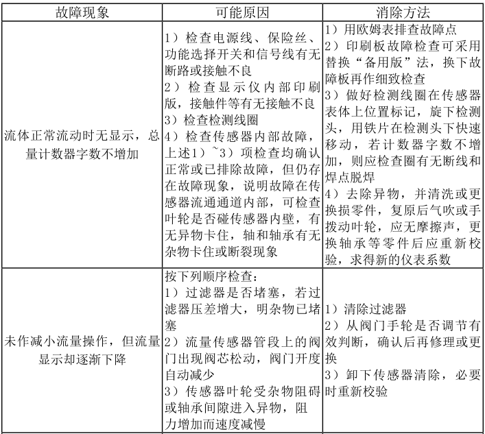 14.為保證流量計長期正常工作,要加強儀表的運行檢查,一旦發(fā)現(xiàn)異常及 時采取措施排除。監(jiān)測葉輪旋轉情況,如聽到異常聲音,用示波器監(jiān)測檢測線圈 輸出波形,如有異常波形,應及時卸下檢查傳感器內部零件。如懷疑有不正?,F(xiàn) 象應及時檢查。保持過濾器暢通,過濾器可從出入口壓力計的壓差來判斷是否堵 塞。要定期排放消氣器中從液體逸出的氣體等等。
